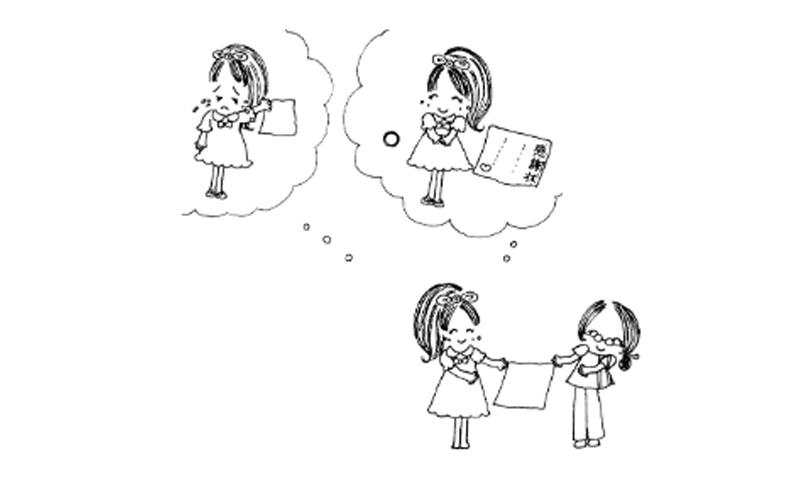 ⑥キョコちゃんは、おばあさんからばら色のハンカチをもらいました。 「ヘルプの喜び運動協会」に送れば、感謝状と缶バッチがもらえます。 また、ばら色のハンカチを使う人にもなれます。